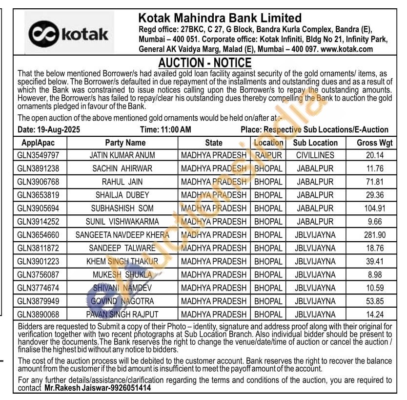 Kotak Mahindra Bank Gold Auctions Auction in Raipur