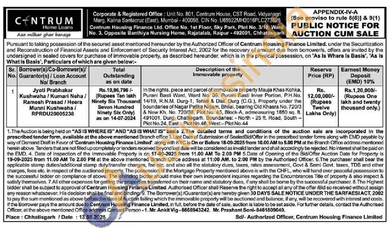 In the rights, piece and parcel of immovable property Mauja Khas Kohka, Purani Basti Ward, Ward No. 09, Purani Basti Inner Portion, P.H.No. 14/19, R.N.M. Durg-1, Tehsil & Dist. Durg (C.G.), Property under the boundaries of Nagar Palika Nigam, Bhilal, bearing Old Khasra No. 720/3 & New Kh. No. 720/38, Plot No. 45, Block-A, admeasuring 1650 sq. ft. 491001, Durg, Chattisgarh. Boundaries: North-25 ft. Road, South-Plot No.24, East-Plot No.46, West-Plot No.44