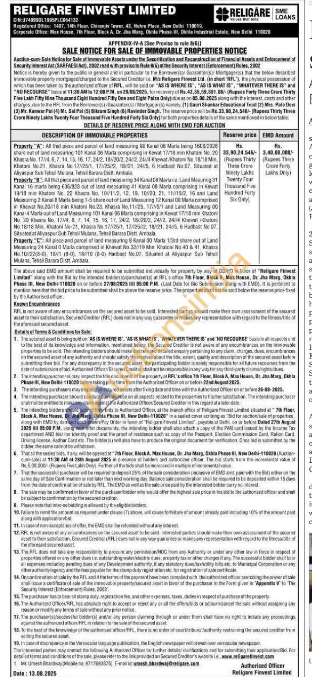 Property "A": All that piece and parcel of land measuring 80 Kanal 06 Maria being 1606/2026 share out of land measuring 101 Kamal 06 Marta comprising in Kewat 17/18 min Khatoni No. 20 Khasra No. 174, 6. 7. 14. 15. 16. 17.24/2, 18/20/224/2, 24/4 Khewat Khatoni No.15/18 Min, Khatom No 21. Khasra No. 17//25/1, 17/25/2, 18/21, 24/5, 6 Hadbast No 07. Situated at Allyaspur Sub Tehsil Mulana, Teisiä Barara Distt. Ambala. Property At that prece and parcel of land measuring 34 Kanal 08 Marta te Land Mesuring 31 Kanal 15 marta being 636/828 out of land measuring 41 Kanal 08 Maria comprising in Kewat 19/18 me Chaton No. 22 Khaars No. 10/11/2, 12, 19, 10/20, 21, 11/15/2, 16 and Land Measuing 2 Kanal 8 Marla being 1-5 share out of Land Measuring 12 Kanal 00 Maria comprised in Khewat No.20//18 min Khatoni No.23, Khasra No.11/25, 17/5/1 and Land Measuring 00 Kanal 4 Maria out of Land Measuring 101 Kanal 06 Maria comprising in Kewal 17/18 min Khaton No. 20 Khasra No. 174, 8, 7, 14, 15, 16, 17, 24/2, 18//20/2, 24/12, 24/14 Khewat Khatoni No. 18/10 Min. Khatoni No-21. Khasra No 17/25/1 17/25//218/21, 24/5 6 Hathast No 07. Situated at Alyaspur Sulh Tehsil Mulana, Tehsil Barara Distt. Ambala Property "C": All piece and parcel of land measuring 8 Kanal 00 Maria 1/3rd share out of Land Measuring 24 Kanal 0 Maria comprised in Khewat No.32/19 Min, Khatoni No.40 & 41, Khasra No. 10/228-0). 16/1 (8-0), 18/10 (3-0) Hadtast No.07, Situated at Alyaspur Sub Te Mulana, Tehsi Barara Distt. Ambala
