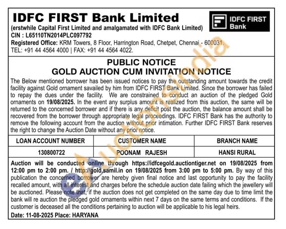 IDFC First Bank Ltd Gold Auctions Auction in Chennai