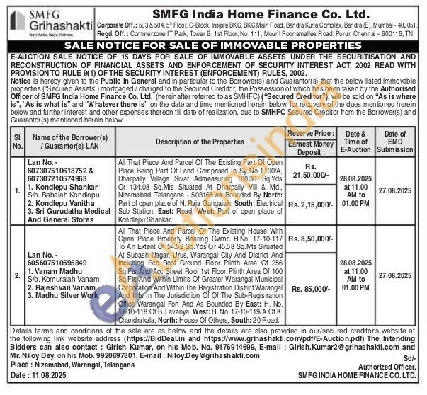 All That Piece And Parcel Of The Existing House With Open Place Proeprty Bearing Gwmc H.No. 17-10-117 To An Extent Of 54.52 Sq. Yds Or 45.58 Sq.Mts Situated At Subash Nagar, Urus, Warangal City And District And Including Ricc Roof Ground Floor Plinth Area Of 256 Sq.Fts And Acc Sheet Roof 1st Floor Plinth Area Of 100 Sq.Fts And Within Limits Of Greater Warangal Municipal Corporation And Within The Registration District Warangal And It Is In The Jurisdiction Of Of The Sub-Registration Office Warangal Fort And As Bounded By East: H. No. 17-10-118 Of B. Lavanya, West: H. No. 17-10-119/A Of K. Chandrakala, North: House Of Others, South: 20 Road