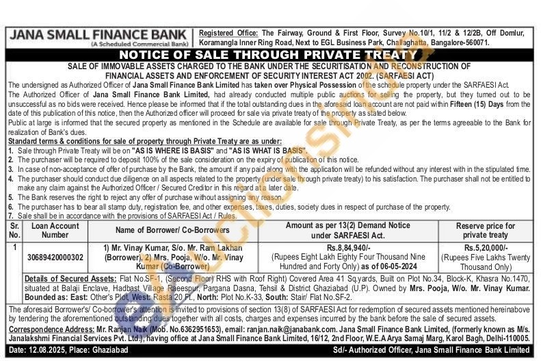 Flat No.SF-1, (Second Floor) RHS with Roof Right) Covered Area 41 Sq.yards, Built on Plot No.34, Block-K, Khasra No. 1470, situated at Balaji Enclave, Hadbast Village Raeespur, Pargana Dasna, Tehsil & District Ghaziabad (U.P). Owned by Mrs. Pooja, W/o. Mr. Vinay Kumar. Bounded as: East: Other's Plot, West: Rasta 20 Ft., North: Plot No.K-33, South: Stair/ Flat No.SF-2.