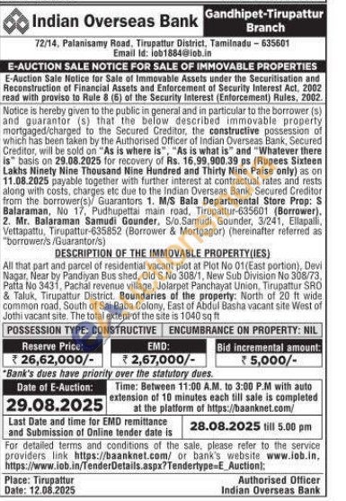 DESCRIPTION OF THE IMMOVABLE PROPERTY(IES) All that part and parcel of residential vacant plot at Plot No 01(East portion), Devi Nagar, Near by Pandiyan Bus shed, Old S No 308/1, New Sub Division No 308/73, Patta No 3431, Pachal revenue village, Jolarpet Panchayat Union, Tirupattur SRO & Taluk, Tirupattur District. Boundaries of the property: North of 20 ft wide common road, South of Sai Baba Colony, East of Abdul Basha vacant site West of Jothi vacant site. The total extent of the site is 1040 sqft