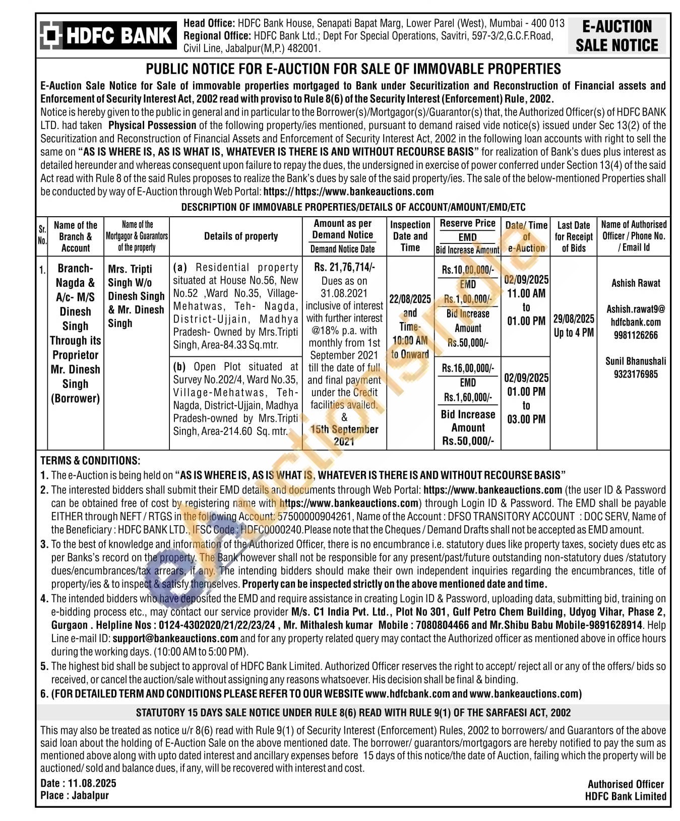 Residential property situated at House No.56. New No.52 Ward No.35, Village-Mehatwas, Teh Nagda, District-Ujjain, Madhya Pradesh- Owned by Mrs. Tripti Singh, Area-84.33 Sq.mtr.