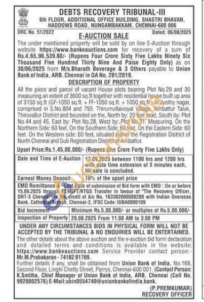All the piece and parcel of vacant House plots bearing Plot No.29 and 30 measuring an extent of 3600 sq.ft together with residential house built up area of 3150 sq.ft (GF-1050 sq.ft. + FF-1050 sq.ft. + 1050 sq.ft.) in Jyothy nagar, comprised in S.No.804 and 793. Thirumullaivoyal Village. Ambattur Taluk, Thiruvallur District and bounded on the, North by: 20 feet road, South by: Plot No.44 and 45, East by: Plot No.28, West by: Plot No.31. Measuring. On the Northern Side: 60 feet, On the Southern Side: 60 feet, On the Eastern Side: 60 feet. On the Western side: 60 feet, situated within the Registration District of North Chennai and Sub Registration District of Ambattur.