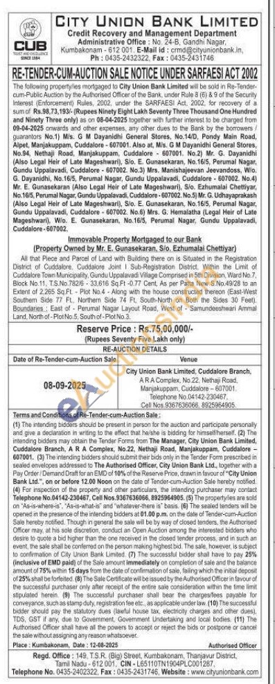Immovable Property Mortgaged to our Bank (Property Owned by Mr. E. Gunasekaran, Sio, Ezhumalai Chettiyar) All that Piece and Parcel of Land with Building there on is Situated in the Registration District of Cuddalore. Cuddalore Joint | Sub-Registration District. Within the Limit of Cuddalore Town Municipality, Gundu Uppalavadi Village Comprised in 5th Division, Ward No. 7, Block No.11, TS.No 782/6-33.616 Sq Ft -0.77 Cent, As per Patts New S.No.49/28 to an Extent of 2.265 Sq FL-Plot No.4-Along with the house constructed thereon (East-West Southem Side 77 Ft. Northern Side 74 Ft. South-North on Both the Sides 30 Feetj Boundares East of Perumal Nagar Layout Road, West of Samundeeshwari Ammal Land, North of-Plot No. 5, South of-Plot No.3
