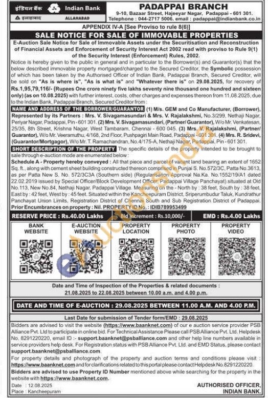 Schedule A-Property hereby conveyed: All that piece and parcel of vacant land bearing an extent of 1652 Sq. ft., along with cement sheet building constructed thereon comprised in Punjai S. No.572/3C, Patta No.3613 as per Patta New S. No. 572/3C3A (Southern side) (Regularisation Approval Na Ka. No. 1552/19/A1 dated 22.02.2019 issued by Special Officer/Block Development Officer, Padappai Village Panchayat) situated at Old No. 113, New No.84, Nethaji Nagar, Padappai Village. Measuring on the North by: 38 feet, South by: 35 feet East by: 42 feet, West by: 45 feet. Situated within the Kancheepuram District, Sriperumbudur Taluk, Kundrathur Panchayat. Union Limits, Registration District of Chennai South and Sub Registration District of Padappai, Prior Encumbrances on property: Nil. PROPERTY ID No.: IDIB789953499