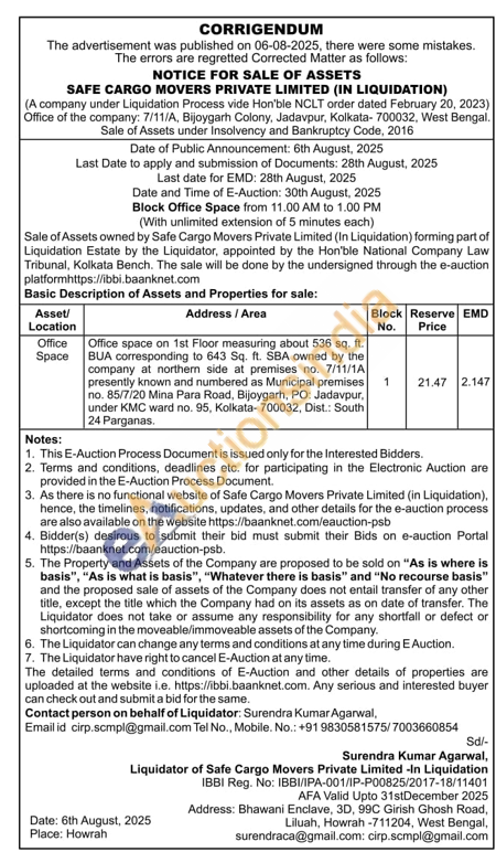 Office space on 1st Floor measuring about 536 sq. ft. BUA corresponding to 643 Sq. ft. SBA owned by the company at northern side at premises no. 7/11/1A presently known and numbered as Municipal premises по. 85/7/20 Mina Para Road, Bijoygarh, PO: Jadavpur, under KMC ward no. 95, Kolkata- 700032, Dist.: South 24 Parganas
