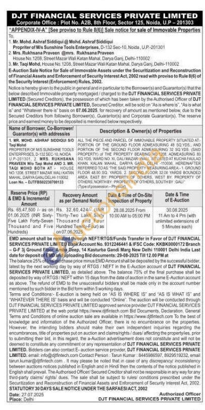 ALL THE PIECE AND PARCEL OF IMMOVABLE PROPERTY SITUATED AT PORTION OF THE GROUND FLOOR ADMEASURING 48 50 YDS, AND PORTION OF THE SECOND FLOOR ADMEASURING 32 80 YDS (SAID PROPERTY & THE PROPERTY BEARING NO 1208 ADMEASURING 80 50 YDE WARD NO 10, GALI MAZAR WALI, SITUATED AT KUCHA FAULAD KHAN, KALAN MAHAL DARIYA GANJ DELHI-110006 HEREINAFTER REFERRED TO AS THE SAID PROPERTY MEASURING AREA 1 GROUND FLOOR 48.00 SQ. YARDS. 2. SECOND FLOOR 12.00 YARDS BOUNDED AREA EAST BY PROPERTY OF OTHERS, WEST BY PROPERTY OF OTHERS, NORTH BY PROPERTY OF OTHERS, SOUTHEY GALI (Type ofpossession-Physical