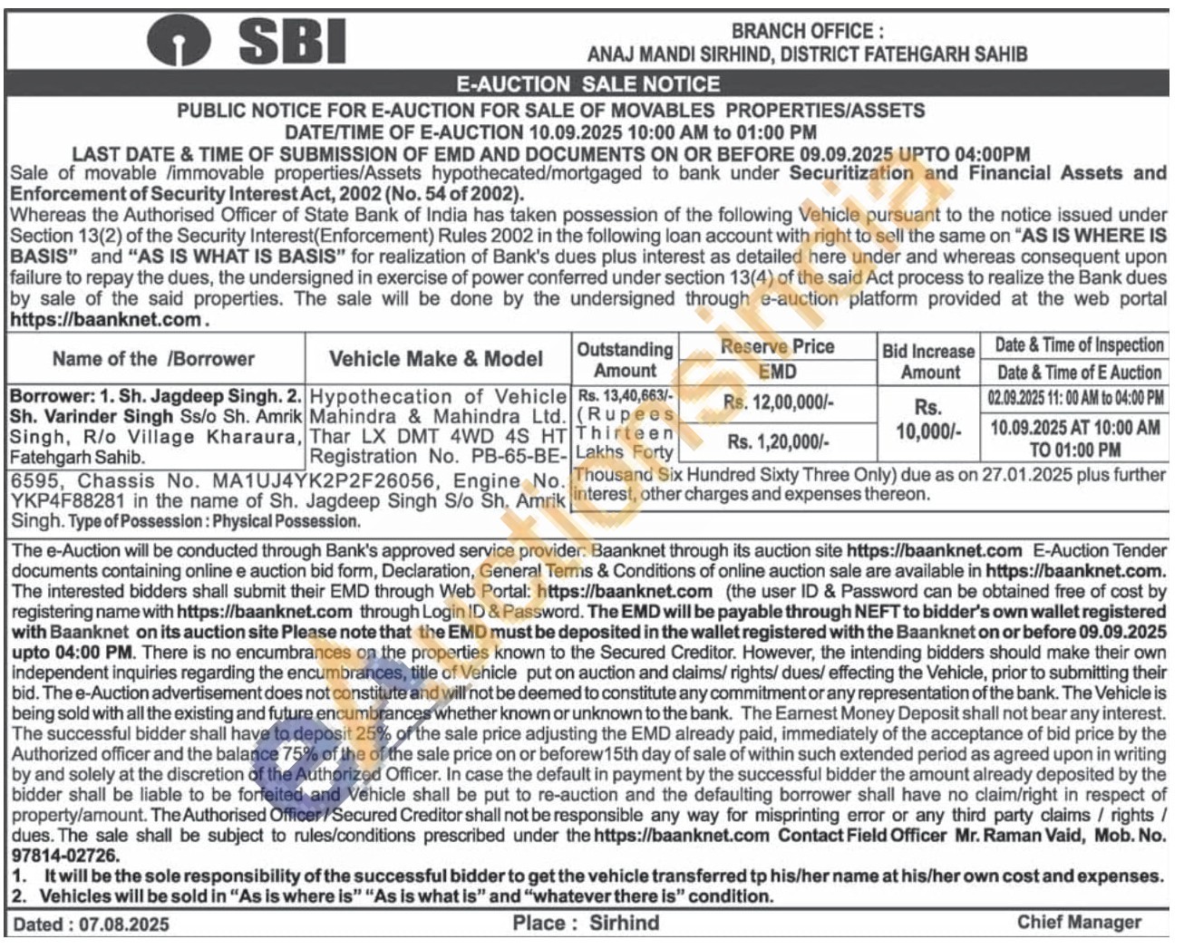 Hypothecation of Vehicle Mahindra & Mahindra Ltd. , Thar LX DMT 4WD 4S HT Registration No. PB-65-BE 6595, Chassis No. MA1UJ4YK2P2F26056, Engine No YKP4F88281 in the name of Sh. Jagdeep Singh S/o Sh. Amrik Singh. Type of Possession: Physical Possession.