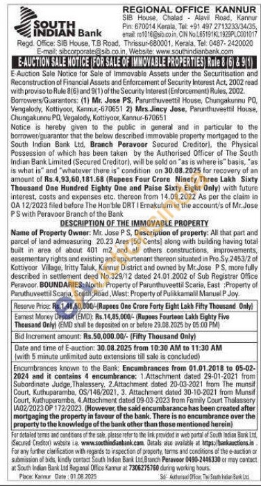 All that part and parcel of land admeasuring 20.23 Ares [50 Cents] along with building having total built in area of about 401 m2 and all others constructions, improvements, easementary rights and existing and appurtenant thereon situated in Pro Sy.2453/2 of Kottiyoor Village, Iritty Taluk, Kannur District and owned by Mr.Jose PS, more fully described in settlement deed No.329/12 dated 24.01.2002 of Sub Registrar Office Peravoor. BOUNDARIES: North: Property of Parunthuveettil Scaria, East Property of Paruthuveettil Scaria, South: Road, West: Property of Pulikkamalil Manuel P Joy