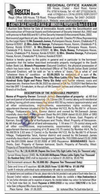 All that part and parcel of land admeasuring 16.10ares (39.75 cents) along with residential building having plinth area measuring about 493.50 sq.meters (approximately) and all other constructions, improvements, easementary rights existing and appurtenant thereon situated in Old Sy Number 44/1C2, Re Sy No.68/14 of Korom Village, Thaliparamba Taluk, Kannur district and owned by Mr.Saneesh James morefully described in Assignment Deed No.841/2004 dated 03.03.2004 of SRO Payyannur, BOUNDARIES: North Road & Property of Koran, East: Property of Kannan, South: Property of Karthyayani and Thodu, West: Property of Narayanan. b) All that part and parcel of land admeasuring 7.18 ares (17.75 cents) along with all other constructions, improvements, easementary rights existing and appurtenant thereon consisting of 4.35 ares (10.75 cents) Sy Number 44/4, Re Sy No.68/20 & 2.83 ares 17 Cents) in Sy Number 44/1C2, Re Sy No.68/15 of Korom Village, Thaliparamba Taluk, Kannur district and owned by Mr.Saneesh James morefully described in Jenmam Assignment Deeds No.703/2006 dated 23.02.2006 and No.691/2006 dated 23.02.2006 of SRO Payyannur. BOUNDARIES: North: Thodu, East: Property of Kannan karnavar, South: Property of Parvathy, West: Property of Panankkaran Padmanabhan.