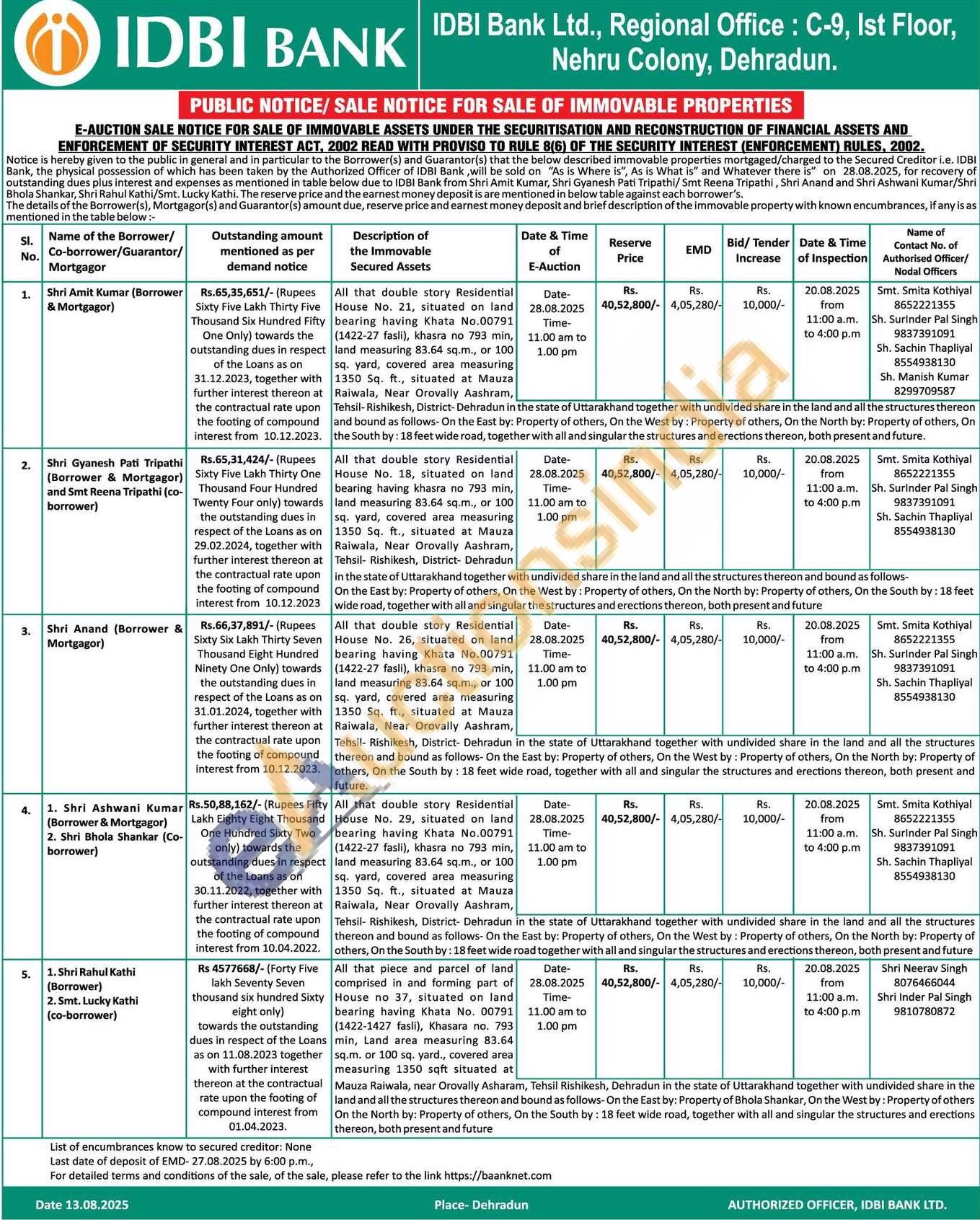 All that double story Residential House No. 29, situated on land bearing having Khata No.00791 (1422-27 fasli), khasra no 793 min, land measuring 83.64 sq.m., or 100 sq. yard, covered area measuring 1350 Sq. ft., situated at Mauzal Raiwala, Near Orovally Aashram Tehsil- Rishikesh, District- Dehradun in the state of Uttarakhand together with undivided share in the land and all the structures thereon and bound as follows- On the East by: Property of others, On the West by: Property of others, On the North by: Property of others, On the South by: 18 feet wide road together with all and singular the structures and erections thereon, both present and future
