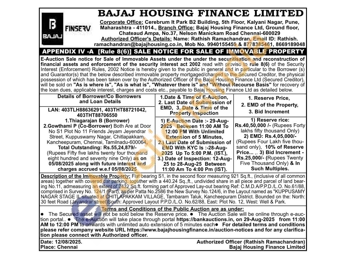 Description of the Immovable Property: Flat bearing S1, in the second floor measuring 921 Sq.ft., (inclusive of all common areas) together with covered car parking, together with a 440.24 Sq.,ft., undivided share in all piece and parcel of land bear-ing No.11, admeasuring an extent of 2432 Sq.ft. forming part of Approved Lay-out bearing Ref: C.M.D.A/P.P.D./L.O. No.61/88, comprised in Survey No. 124/1 (Part), as per Patta No.2586 the New Survey No. 124/6, in the Layout named as "KUPPUSAMY NAGAR STAGE II, situated at CHITLAPAKKAM VILLAGE, Tambaram Taluk, Kancheepuram District. Bounded on the: North: 30 feet Road (Jayandrar street)South: Approved Layout P.P.D./L.O. No.62/88, East: Plot No. 12, West: Well & Park