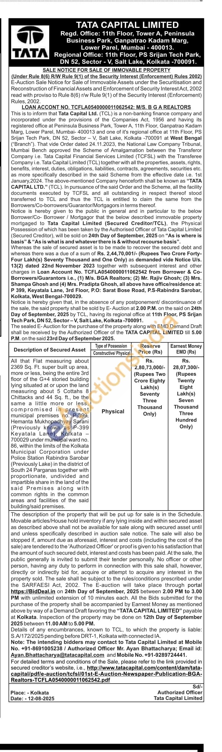 All that Flat measuring about 2369 Sq. Ft. super built up area, more or less, being the entire 3rd floor of the G+4 storied building lying situated at or upon the land measuring about 5 Cottahs 8 Chittacks and 44 Sq. ft., be the same a little more or less, compromised in present municipal premises no. P-399, Hernanta Mukhopadhyay Sarani (Previously known as P-399 Keyatala Lane), Kolkata 700029 under municipal ward no. 86, within the limits of the Kolkata Municipal Corporation under Police Station Rabindra Sarobar (Previously Lake) in the district of South 24 Parganas together with proportionate, undivided and impartible share in the land of the said Premises along with common rights in the common areas and facilities of the said building/said premises.
