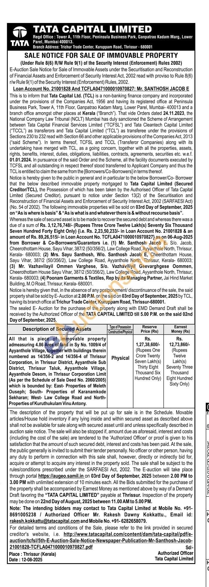 All that is piece of immovable property admeasuring 4.86 Ares of land in Sy No. 1009/4 of Ayyanthole Village, together with buildings therein numbered as 14/356-2 and 14/356-4 of Thrissur Corporation, in Thrissur District, Ayyanthole Sub District, Thrissur Taluk, Ayyanthole Village, Ayyanthole Desom, in Thrissur Corporation Limit (As per the Schedule of Sale Deed No. 2060/2005) which is bounded by: East- Properties of Meleth Ouseph; South Properties of Karanamkode Sekharan; West- Law College Road and North-Properties of Kuruthukulam Vinu Antony.