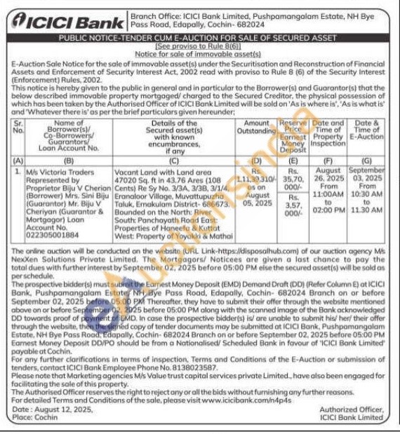 Vacant Land with Land area 47020 Sq. ft in 43.76 Ares (108 Cents) Re Sy No. 3/3A, 3/38, 3/1/4, Eranaloor Village, Muvattupuzha Taluk, Emakulam District-686673, Bounded on the North: River South: Panchayath Road East Properties of Haneefa & Kuttat West: Property of Yoyakki & Mathai