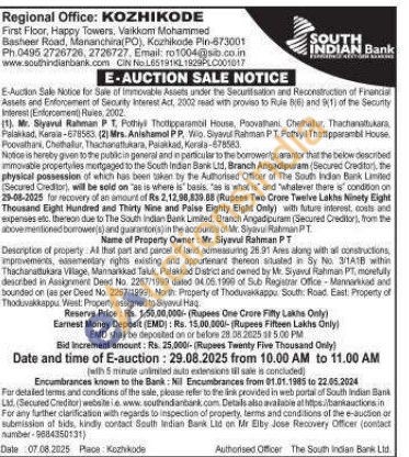 Al that part and parcel of land admeasuring 26.91 Ares along with all constructions, этрометель, вазementary rights existing and appurtenant thereon situated in Sy No 3/141B with Thachanattukara Village, Mannarkkad Taluk, Palakkad District and owned by Mr. Siyavul Rahman PT. morefully described in Assignment Deed No 2267/1999 dated 04.06.1000 of Sub Registrar Office Mannarskad and bounded on (as per Deed No. 2267/1999), North Property of Thoduvakkappy South Road East Property of