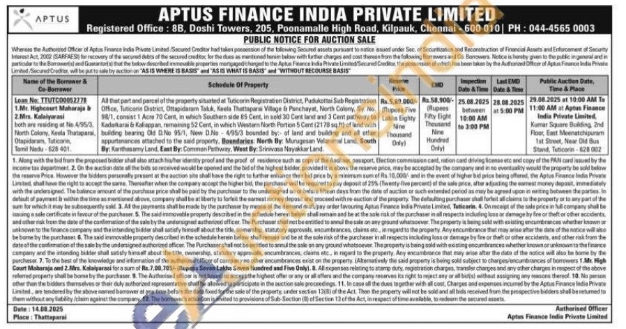 All that part and parcel of the property situated at Tuticorin Registration District, Pudukottai Sub Registration Office, Tuticorin District, Ottapidaram Taluk, Keela Thattaparai Village & Panchayat, North Colony, Sy. No. 98/1, consist 1 Acre 70 Cent, in which Southern side 85 Cent, in sold 30 Cent land and 3 Cent pathway to Kadarkanai & Kaliappan, remaining 52 Cent, in which Western North Portion 5 Cant (2178 sq.ft) of land with building bearing Old D.No 95/1, New D.No 4/95/3 bounded by: of land and building and all other appurtenances attached to the said property, Boundaries: North By: Murugesan Velammal Land, South By: Kanthasamy Land, East By: Common Pathway, West By: Srinivasa Nayakkar Land