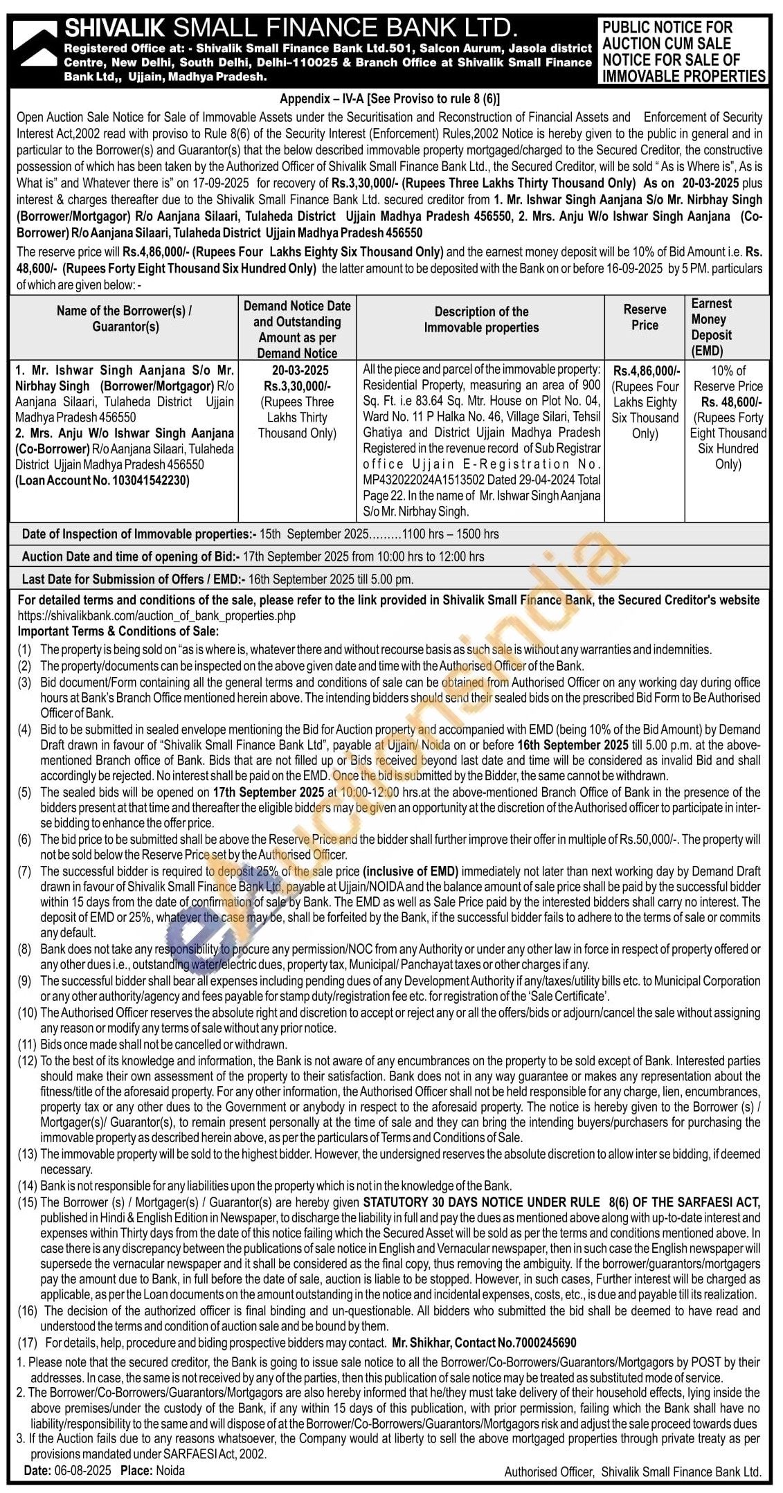All the piece and parcel of the immovable property: Residential Property, measuring an area of 900 Sq. Ft. i.e 83.64 Sq. Mtr. House on Plot No. 04, Ward No. 11 P Halka No. 46, Village Silari, Tehsil Ghatiya and District Ujjain Madhya Pradesh Registered in the revenue record of Sub Registrar office Ujjain E-Registration No. MP432022024A1513502 Dated 29-04-2024 Total Page 22. In the name of Mr. Ishwar Singh Aanjana S/o Mr. Nirbhay Singh