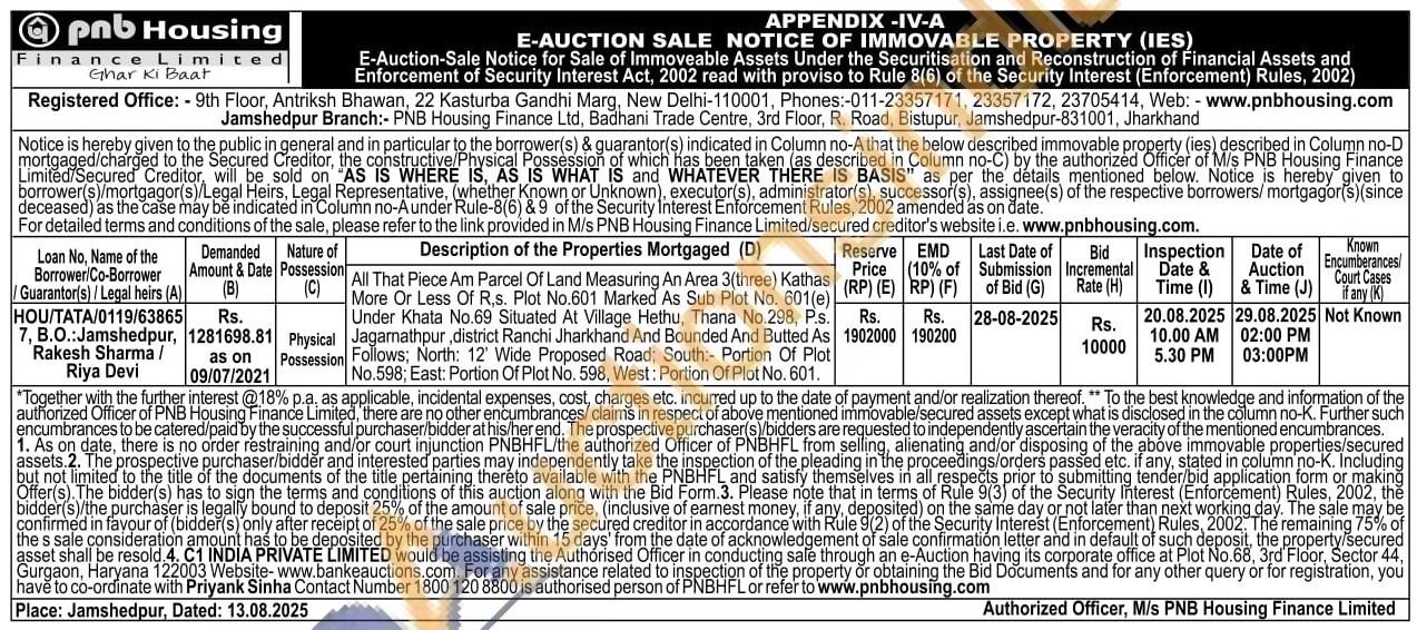 All That Piece Am Parcel Of Land Measuring An Area 3(three) Kathas More Or Less Of R.s. Plot No.601 Marked As Sub Plot No. 601(e) Under Khata No.69 Situated At Village Hethu, Thana No.298, P.s. Jaganathpur, district Ranchi Jharkhand And Bounded And Butted As Follows; North: 12' Wide Proposed Road; South:- Portion Of Plot No.598; East: Portion Of Plot No. 598, West: Portion Of Plot No. 601