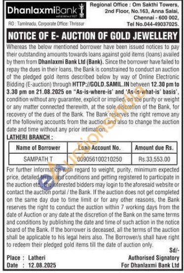 Dhanlaxmi Bank Gold Auctions Auction in Vellore