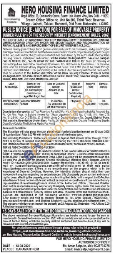 All That Plece And Parcel Of Flat No. 4, Admeasuring Built Up Area 640 Sq Pt. On First Floor, In Building Known As. "Akash Apartment, CTS No. 171/28/TK/1, New CTS No.191/28/1K/1 Out Of CTS No. 2712 Within Limits Of Daund Kadgaon, Tal. Daund, District-Pune, Maharashtra. Bounded As Under: East: Flat No.06, West: Open Side Outside The Building, South: Open Side Outside The Building, North: Flat No.03