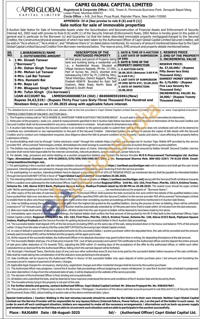 All that piece and parcel of Property being land and building being a residential unit Le., a Residential House, Situated at Village Haripura Najdeek, PH No. 13 (06), Part of Survey No. 242/3, diverted area Admeasuring 12917 Sq. Ft. (1200 Sq. Mts), Tehsil Khiichipur, District Rajgarh, Madhya Pradesh 465679 Bounded As: East: Self Godown, West: Road, North: Bada of Bapulal Ji, South: Road