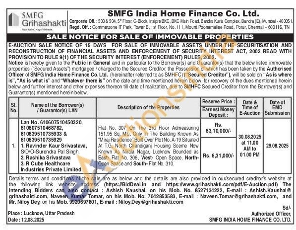 Flat No. 307 On The 3rd Floor Admeasuring 151.95 Sq. Mts. Only In The Building Known As "Miraj Residence" Built Over Plot No. A-19 Situated At T.G. North Chandiganj Housing Sceme Now Known As Nirala Nagar, Lucknow Bounded as East- Flat No. 306, West- Open Space, North Open Space and South-Flat No. 310.