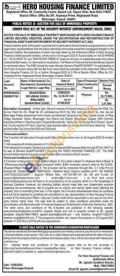 All that rigtit title and interest of Property bearing City Survey No 5258. City Survey Ward No 4A, Sheet No 43, admeasuring 66 03 Sq. Mts land and 96.48 Sq mis jas per Bhavnagar Palka Assessment form) known as Kantiwad Vanamona Na Delo, Sandar chook, of Moje Village Kanbivad, Takka Bhavnagar, Sub District and District Bhavnagar, Gujarat. With Common Amenities Written in Title Document. Property Bounded By: North Adj. City Survey No 5159land, South Adj. City Survey No 5157 land, East Adj Vado and then after City Survey No 5162 land West Adj. Road and then after City Survey No 5305 and 5308 land