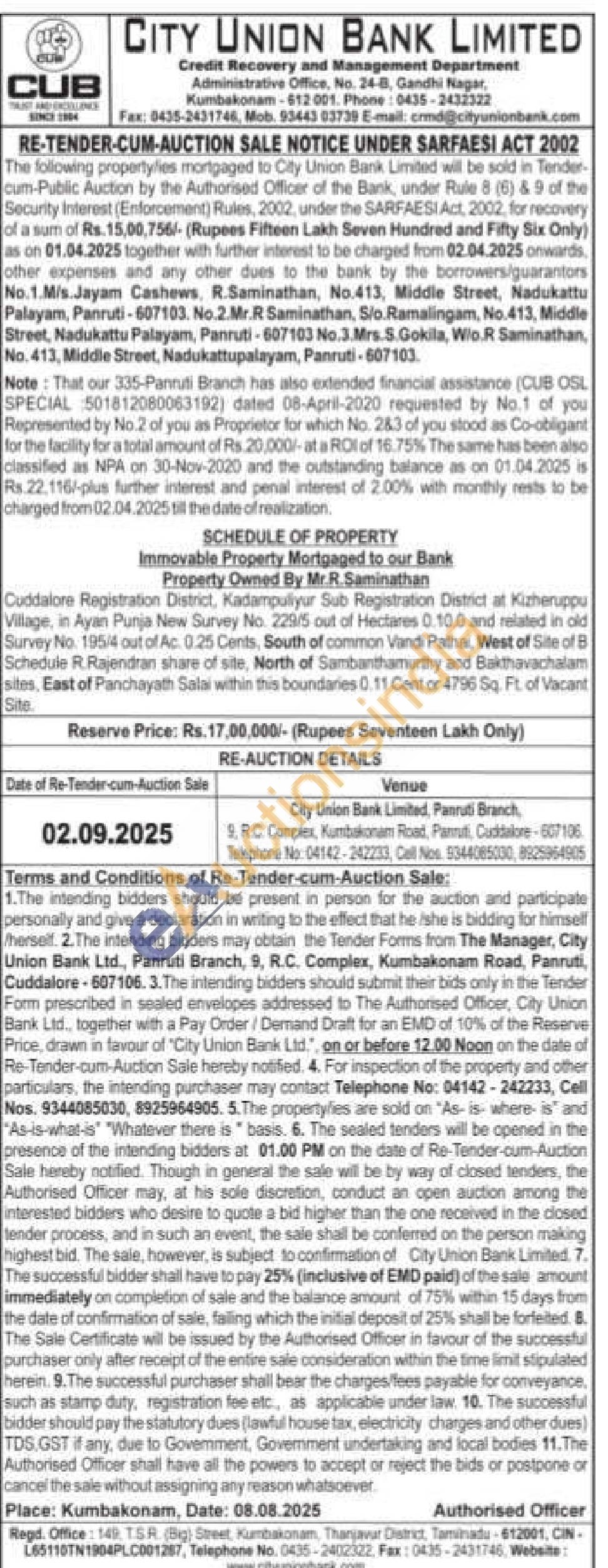 Cuddalore Registration District, Kadampullyur Sub Registration District at Kizheruppu Village, in Ayan Punija New Survey No. 229/5 out of Hectares 0.10.0 and related in old Survey No. 195/14 out of Ac. 0.25 Cents, South of common Vandi Pathal, West of Site of B Schedule R. Rajendran share of site, North of Sambanthamurthy and Bakthavachalam sites, East of Panchayath Salai within this boundaries 0.11 Cent or 4796 Sq. Ft. of Vacant Site
