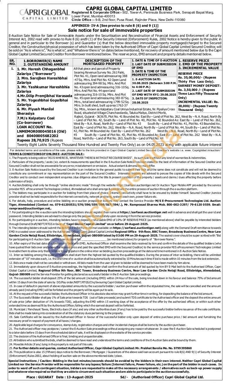 All that piace and parcel of Property bearing Revenue Survey No. 261 Paiki Plot No. 41, Open land admeasuring 388 -475q. Mtrs. Mtrs. And Plot No. 42 Open Land admeasuring 394-98 Sq. Mtrs. And Plot No. 43 open land admeasuring 316-105g. Mtrs. And Plot No. 44 openland.admeasuring 316-10 Sq. Mtrs. And Plot No. 45 open land admeasuring 383-875q. Mtrs, total land admeasuring 1799-5250. Mtrs. In built shed, built up area 1762-37 Mtrs. In built shed, built up area 1762-37 Sq. Mtrs, known as Kalpataru Coal Umiya Industrial Estate, Nr. Pipaliya Cross Road, situated at Village Chanchavdarda Rajkot, Gujarat-363670, Plot No. 41 Bounded As: East By-Land of Plot No. 262, West By -N.A. Road, North By -Land of Plot No. 42, South By Land of Plot No. 40, Plot No. 42 Bounded As: East By- Land of Plot No. 262, West By N.A. Road, North By Land of Plot No. 43 South By Land of Plot No. 41, Plot No. 43 Bounded As, East By Land of Plot No. 262, West By N.A. Road, North By Land of Plot No. 44, South By Land of Plot No. 42, Plot No. 44 Bounded As: East By Land of Plot No. 262 West By-N.A. Road, North By Land of Plot No. South By Land of Plot No. 43, Plot No. 45 Bounded As: East By- Land of Plot No. 262 West By-N.A Road, North By-Land of Plot No. 263, South By-Land of Plot No. 44