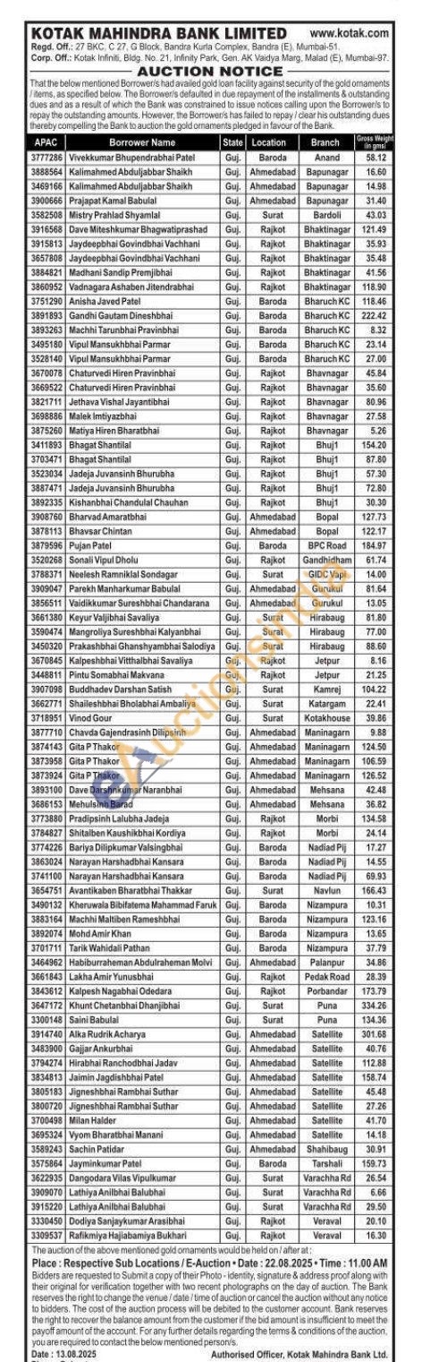 Kotak Mahindra Bank Gold Auctions Auction in Ahmedabad