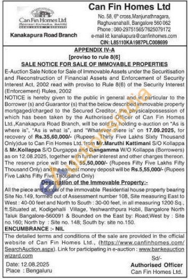 Description of the Immovable Property:- All the piece and parcel of the immovable Residential house property bearing Site No. 149, formed out of Assessment number 108. Site measuring East to West: 40-00 feet and North to South: 30-00 feet, in all measuring 1200 Sq.. ft.Situated at, Kodigehalli Village, Yeshwanthpura Hobli, Bangalore North Taluk Bangalore-560091 & Bounded on the East by: Road West by: Site no.160; North by Site no. 148; South by: site no.150