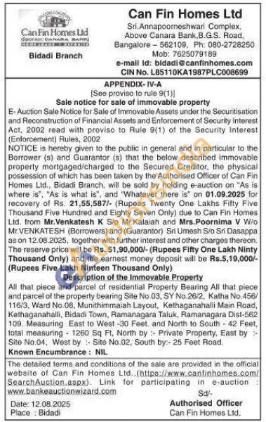 All that piece and parcel of residential Property Bearing All that piece and parcel of the property bearing Site No 03, SY No.26/2, Katha No.456/116/3, Ward No.08, Munithimmaiah Layout, Kethaganahalli Main Road, Kethaganahalli, Bidadi Town, Ramanagara Taluk, Ramanagara Dist-562 109. Measuring East to West -30 Feet, and North to South-42 Feet, total measuring 1260 Sq Ft, North by Private Property, East by Site No.04, West by Site No.02, South by:- 25 Feet Road