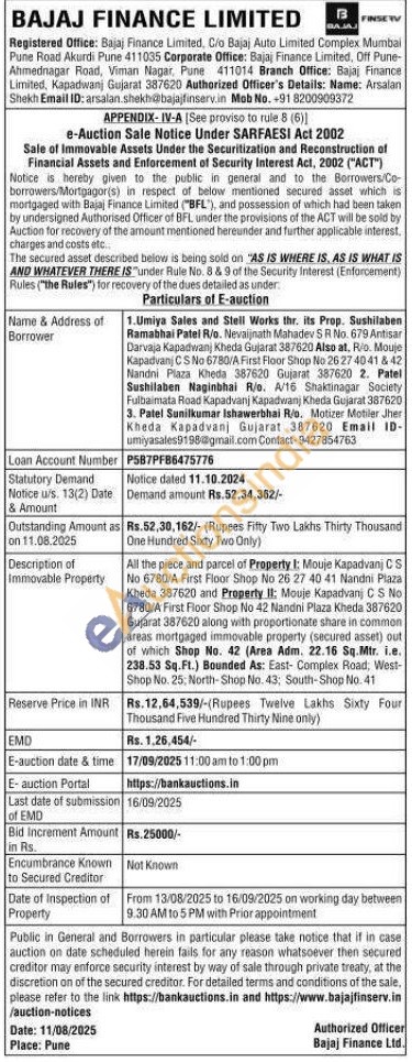 All the piece and parcel of Property I: Mouje Kapadvanj C S No 6780/A First Floor Shop No 26 27 40 41 Nandni Plaza Kheda 387620 and Property II: Mouje Kapadvanj C S No 6780/A First Floor Shop No 42 Nandni Plaza Kheda 387620 Gujarat 387620 along with proportionate share in common areas mortgaged immovable property (secured asset) out of which Shop No. 42 (Area Adm. 22.16 Sq.Mtr. i.e. 238.53 Sq.Ft.) Bounded As: East- Complex Road, West-Shop No. 25; North-Shop No. 43; South-Shop No. 41