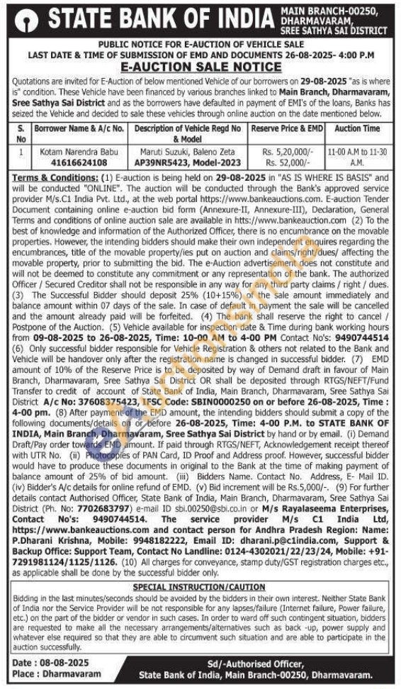 Contact Branch, Dharmavaram, Sree Sathya Sai District (Ph. No: 7702683797)