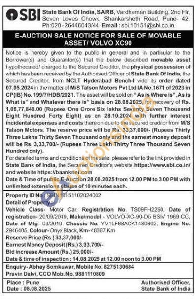 Vehicle Class Motor Car, Registration No. TS09FH2250, Date of registration-20/09/2019, Make/model - VOLVO-XC-90-D5 BSIV 1969 CC, Date of Mfg- 03/2019, Chassis No. YV1LF68ACK1480602, Engine No. 2946405, Colour-Onyx Black, Km-48367 Km