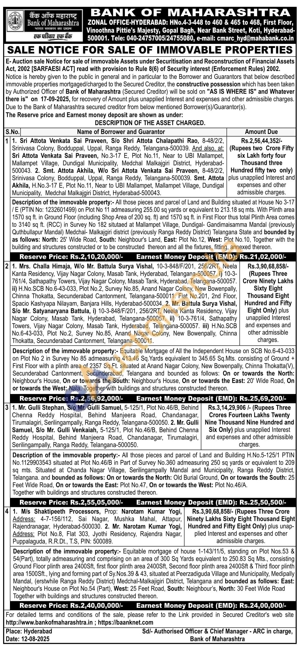 Description of the immovable property:- Equitable Mortgage of All the Independent House on SCB No.6-43-033 on Plot No 2 in Survey No 85 admeasuring 413.46 Sq. Yards equivalent to 345.65 Sq.Mts. consisting of Ground + First Floor with a plinth area of 2357 Sq.Ft. situated at Anand Nagar Colony, New Bowenpally, Chinna Thokatta(V). Secunderabad Cantonment, Secunderabad, Telangana and bounded as follows: On or towards the North: Neighbour's House, On or towards the South: Neighbour's House, On or towards the East: 20° Wide Road, On or towards the West: Nala. Together with buildings and structures constructed thereon.