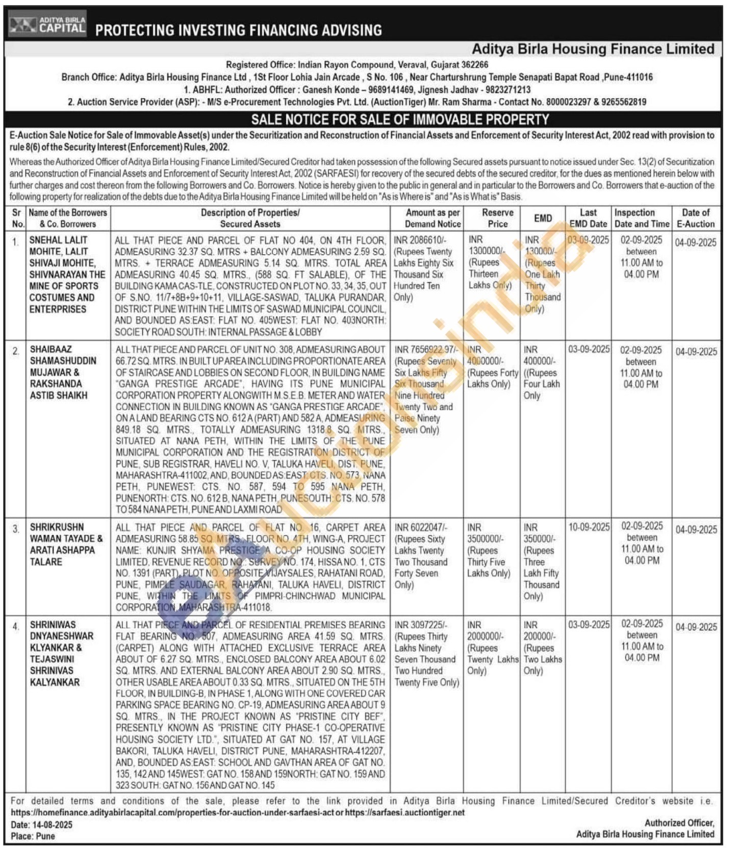 ALL THAT PIECE AND PARCEL OF UNIT NO. 308, ADMEASURINGABOUT 66.72 SQ. MTRS. IN BUILT UPAREA INCLUDING PROPORTIONATE AREA OF STAIRCASE AND LOBBIES ON SECOND FLOOR, IN BUILDING NAME "GANGA PRESTIGE ARCADE, HAVING ITS PUNE MUNICIPAL CORPORATION PROPERTY ALONGWITH MSEB. METER AND WATER CONNECTION IN BUILDING KNOWN AS "GANGA PRESTIGE ARCADE, ON A LAND BEARING CTS NO. 612 A (PART) AND 582 A. ADMEASURING 849.18 SQ MTRS, TOTALLY ADMEASURING 1318.8 SQ MTRS., SITUATED AT NANA PETH, WITHIN THE LIMITS OF THE PUNE MUNICIPAL CORPORATION AND THE REGISTRATION DISTRICT OF PUNE, SUB REGISTRAR, HAVELI NO. V, TALUKA HAVELI, DIST, PUNE, MAHARASHTRA-411002, AND, BOUNDEDAS EAST: CTS. NO. 573, NANA PETH, PUNEWEST: CTS. NO. 587, 594 ΤΟ 595 ΝΑΝΑ ΡΕΤΗ, PUNENORTH CTS. NO. 612 B, NANA PETH, PUNESOUTH: CTS NO. 578 ΤΟ 584 ΝΑΝΑ ΡΕTH, PUNE AND LAXMI ROAD