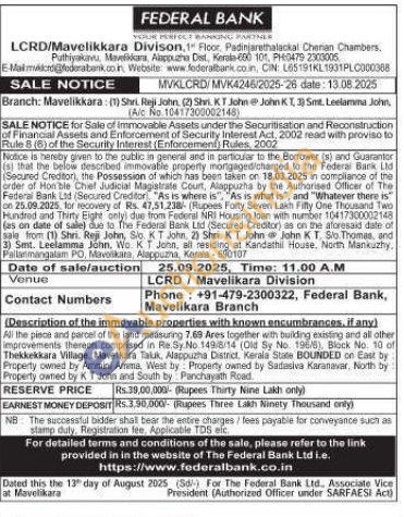 All the piece and parcel of the land measuring 7.69 Ares fogether with building existing and all other improvements thereon comprised in Re. Sy No. 149/8/14 (Old Sy No. 196/6), Block No. 10 of Thekkekkara Village, Maveikara Taluk, Alappuzha District, Kerala State BOUNDED on East by Property owned by Ammini Amma. West by Property owned by Sartasiva Karanavar, North by Property owried by KT John and South by Panchayath Pload