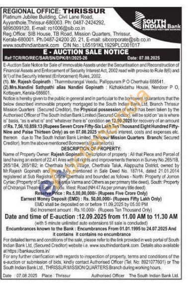 Name of Property Owner Rajesh Gopinath. Description of property: All that Plece and Parcel of land having an extent of 22.41 Ares with all rights and improvements thereon in Survey No. 265/18, 265/184, 265/182, in Cherthala North Village, Cherthala Taluk, Alappuzha District, owned by Mr.Rajesh Gopinath and more fully mentioned in Sale Deed No. 187/14, dated 21.01.2014 registered at Sub Registrar Office Cherthala and bounded as follows-North Property of Jomon Cyriac (Property of Sandhya Rajaraja Varma and Others as per primary title deed). South: Property of Chitranjali Theatre. East: Thodu. West Road (NH 47 As per primary title deed).