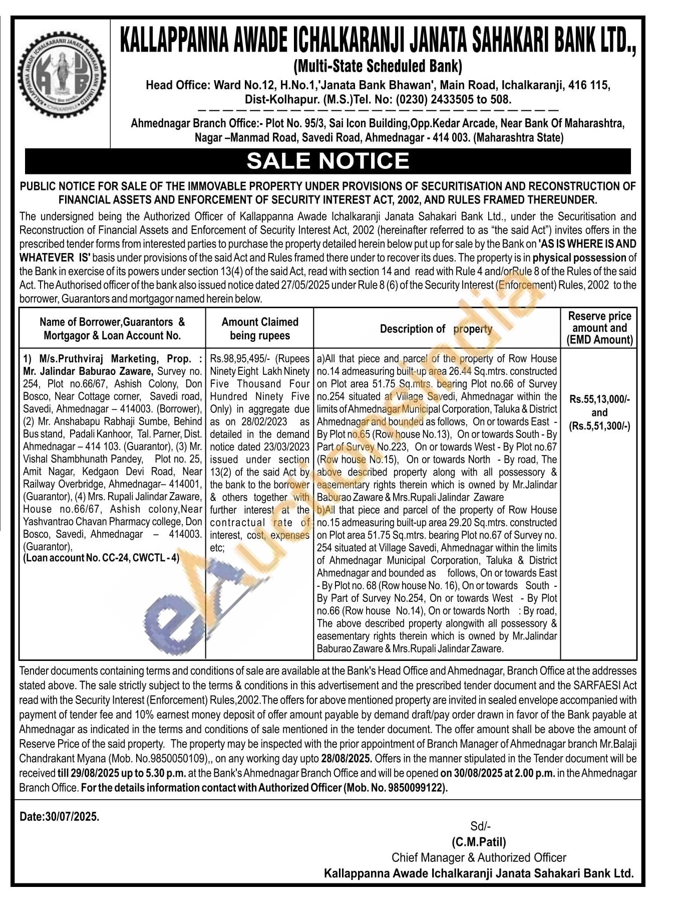 a) All that piece and parcel of the property of Row House no.14 admeasuring built-up area 26.44 Sq.mtrs. constructed on Plot area 51.75 Sq.mtrs. bearing Plot no.66 of Survey no.254 situated at Village Savedi, Ahmednagar within the limits of Ahmednagar Municipal Corporation, Taluka & District Ahmednagar and bounded as follows, On or towards East -By Plot no.65 (Row house No.13), On or towards South -By Part of Survey No.223, On or towards West - By Plot no.67 (Row house No.15), On or towards North By road, The above described property along with all possessory & easementary rights therein which is owned by Mr.Jalindar Baburao Zaware & Mrs. Rupali Jalindar Zaware