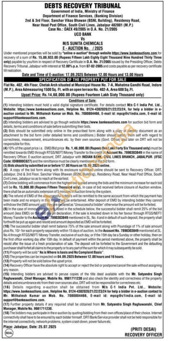 Flat No. 402, 4th Floor, Chetak Arch situated at Municipal House No. 7-A, Mahatma Gandhi Road, Indore ( M.P.), Area Admeasuring 1500 Sq. Ft. with an open terrace No. 402-A, Area 500 Sq. Ft.