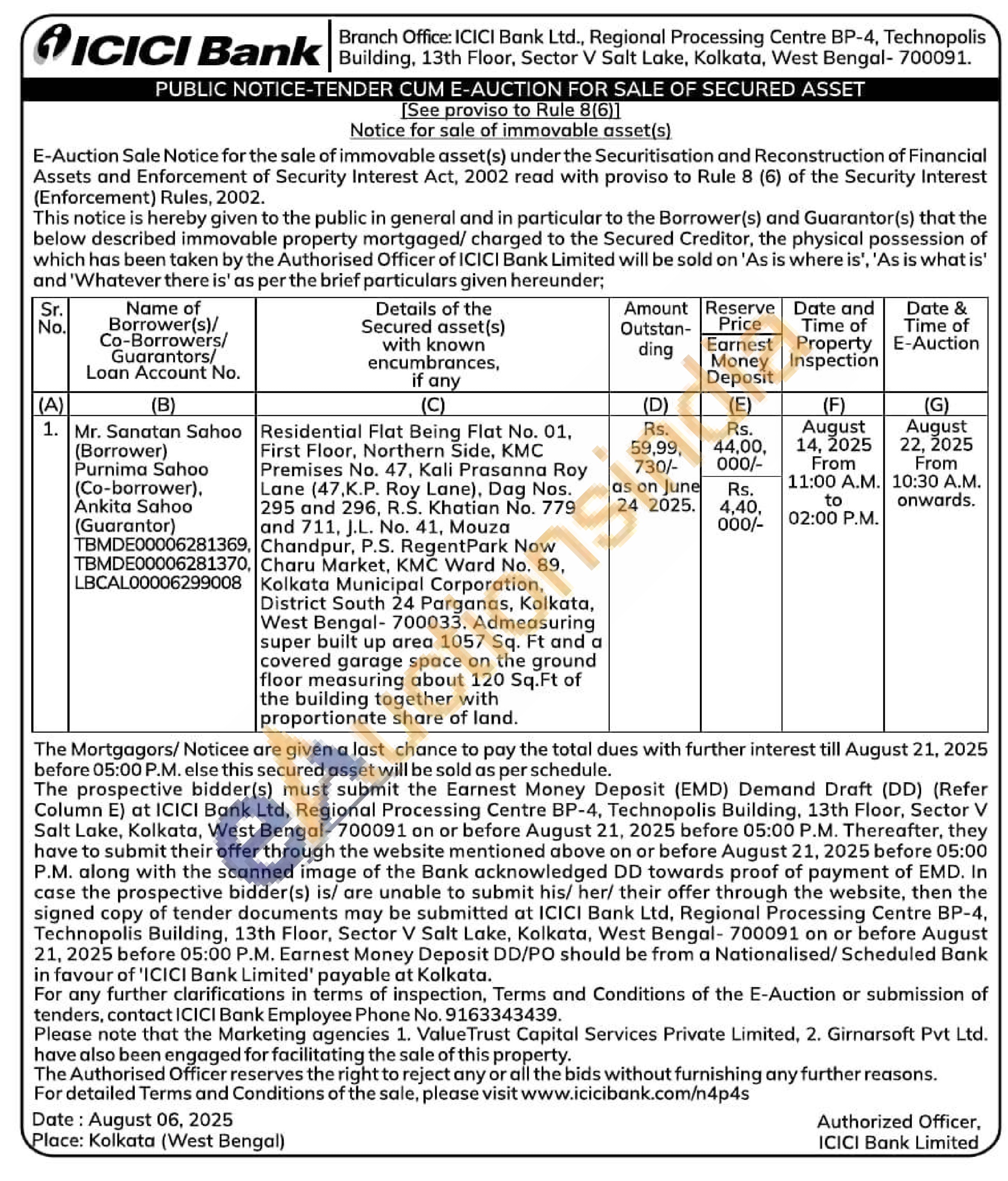Residential Flat Being Flat No. 01, First Floor, Northern Side, KMC Premises No. 47. Kali Prasanna Roy Lane (47,K.P. Roy Lane), Dag Nos. 295 and 296, R.S. Khatian No. 779 and 711, J.L. No. 41, Mouza Chandpur, P.S. RegentPark Now Charu Market, KMC Ward No. 89, Kolkata Municipal Corporation, District South 24 Parganas, Kolkata, West Bengal-700033. Admeasuring super built up area 1057 Sq. Ft and a covered garage space on the ground floor measuring about 120 Sq.Ft of the building together with proportionate share of land