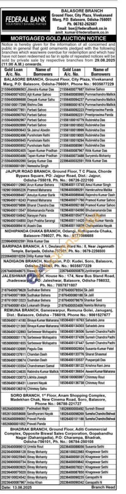 Federal Bank Gold Auctions Auction in Balasore