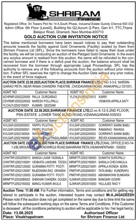 Shriram Finance Ltd Gold Auctions Auction in Visakhapatnam