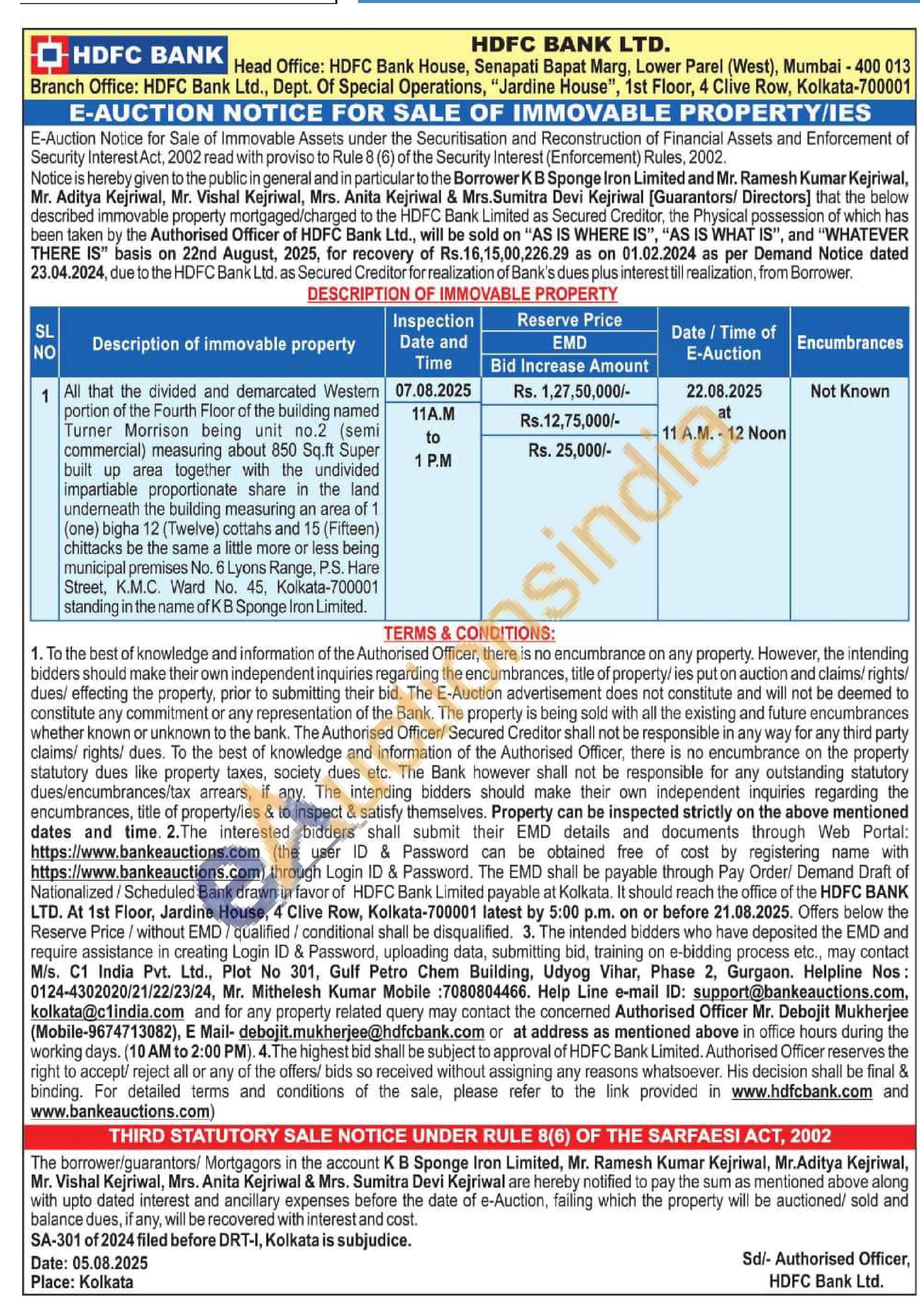 All that the divided and demarcated Western portion of the Fourth Floor of the building named Turner Morrison being unit no.2 (semi commercial) measuring about 850 Sq.ft Super built up area together with the undivided impartiable proportionate share in the land underneath the building measuring an area of 1 (one) bigha 12 (Twelve) cottahs and 15 (Fifteen) chittacks be the same a little more or less being municipal premises No. 6 Lyons Range, P.S. Hare Street, K.M.C. Ward No. 45, Kolkata-700001 standing in the name of KB Sponge Iron Limited