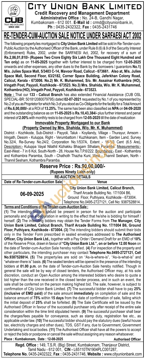 District - Kozhikode, Sub-District - Payyoli, Taluk Koyilandy, Village Thurayur, Amsom-Iringath, Desom-Kuluppa, Right-Verumbattom/Kuzhikanam, Item - Garden Land, Survey No.32/4, Re-Survey No.24/2, Corporation No. 1/537A, Extent 16-1/3 Cent (6.5 Are), Description:- Kuluppa Vayal Nilathil Kizhakku Bhagam Sthalam Paramba. Measurements:-East-West-7 in 6 Kol, South-North-28, House No.T.P.6/222. Boundaries:- East-Kothambra and Kothambra Paramba, South Chathoth Thazha Kuni. West-Thannil Sesham, North-Thannil Sesham, Kothambra Paramba.