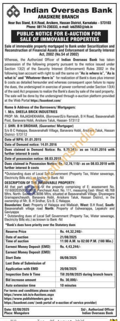 All that part and parcel of the property comprising of E assessment No. 151600203500720002, Panchayat Asst. No. 111, measuring East-West: 48.768 Mtrs. North-South: 76.8096 Mtrs, situated at Basavanahalli Village, Shyanegere Gramapanchayath, Banavara Hobli, Arisikere Taluk, Hassan District, in the ownership of Mr. B. H Sridhar, S/o B. C Halappa